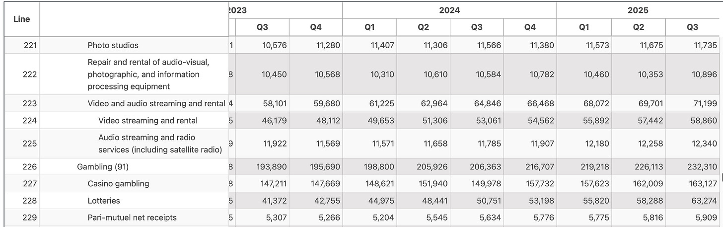 What stands out isn’t just the size. It’s the consistency. Gambling spending rises quietly quarter after quarter, barely reacting to economic cycles. That suggests something deeper than novelty or hype. Risk itself has become a form of entertainment – or perhaps it always has been. Either way, participation matters more than outcomes. People aren’t just consuming products or experiences. They’re consuming uncertainty.