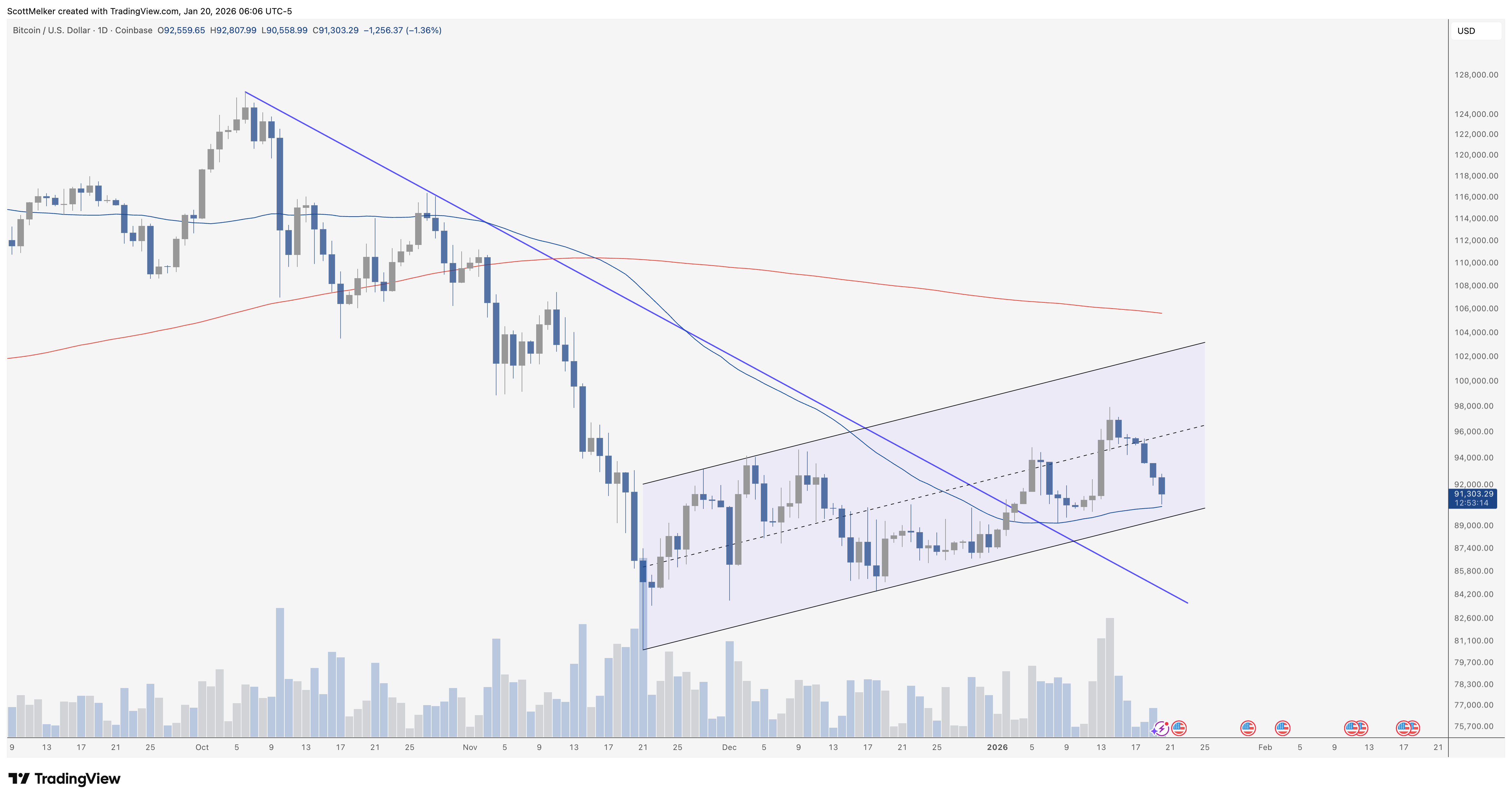 Importantly, this represents a failed pattern rather than a failed trend. Bitcoin remains within the broader rising channel from the November lows, and downside price action has been orderly rather than impulsive. For now, this suggests the market needs additional time to consolidate before attempting another push higher. A loss of rising channel support would be required to shift the broader structural bias.