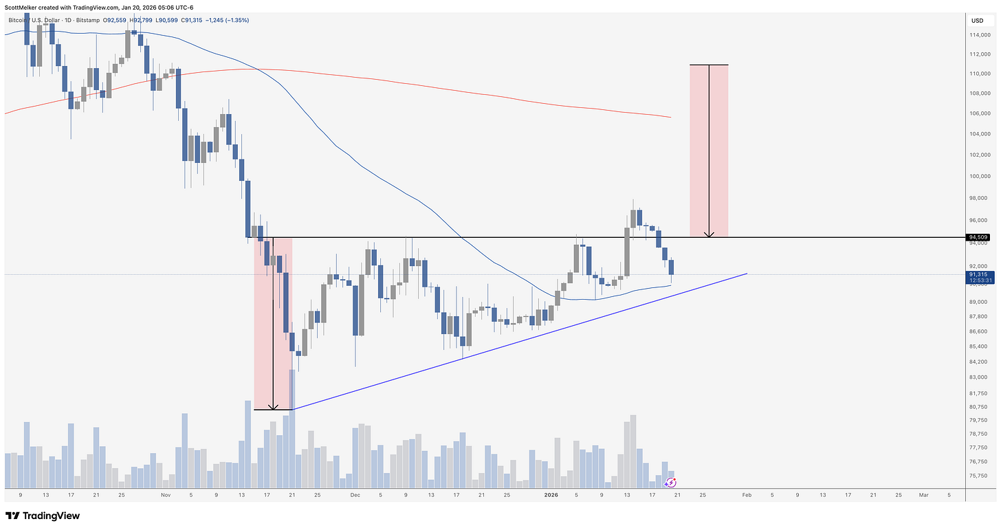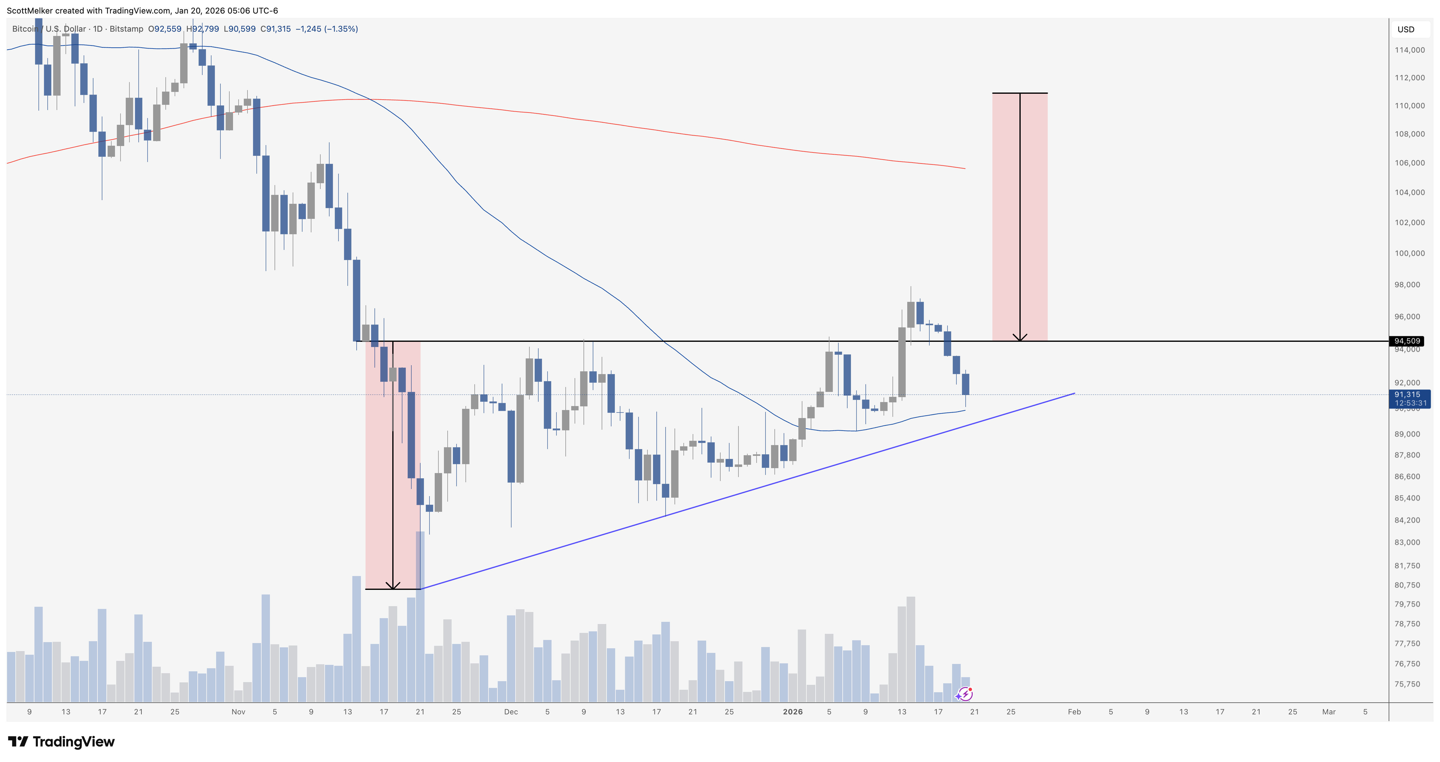 Bitcoin has moved back below the former resistance zone around 94–95K, invalidating the recent ascending triangle breakout. With price no longer holding above that level, the measured move target associated with the pattern is off the table.