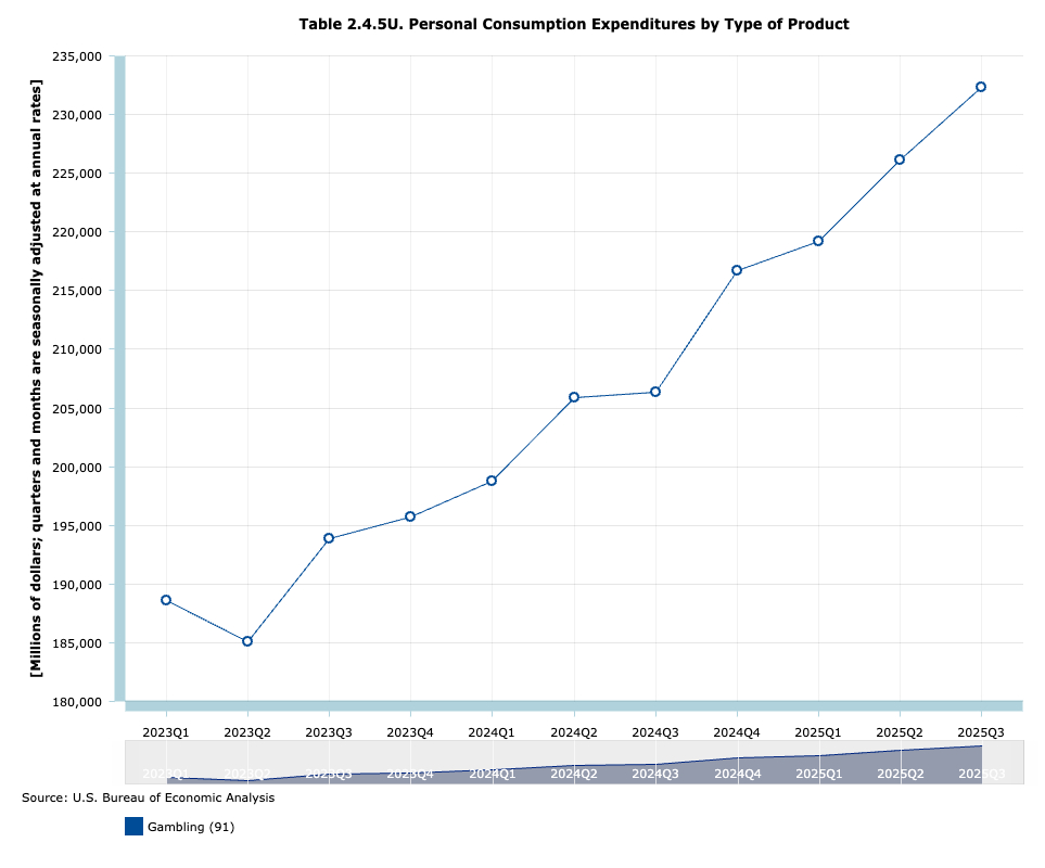 According to the Bureau of Economic Analysis, gambling now accounts for more than $200 billion a year in personal consumption expenditures – and the number is still rising. What most people miss is what that figure actually represents. It isn’t total wagers. It isn’t flashy betting volume. It’s already filtered.