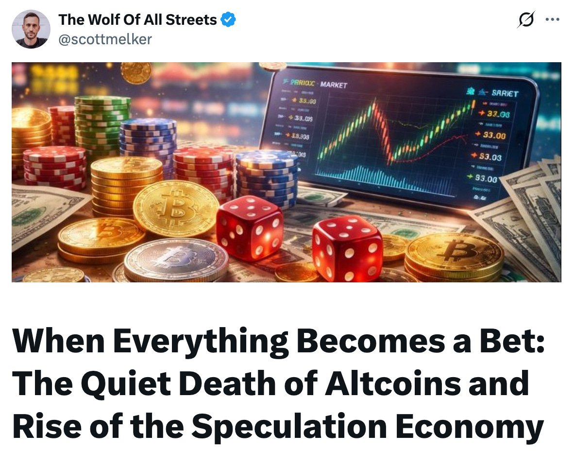 Not because the technology stopped improving. Not because participants suddenly became disciplined investors. But because altcoins were always competing more for attention than for capital. Their core function, especially last cycle, was to package speculation into something people could rally around – memes, themes, roadmaps, communities. Once speculation itself became cleaner, faster, and more directly tied to real-world outcomes, that packaging started to look unnecessary.