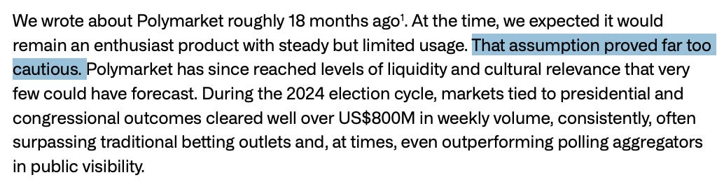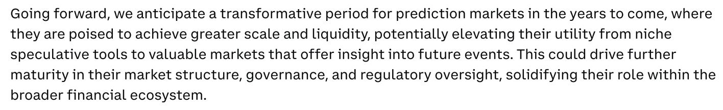 If there’s one call I actually feel comfortable making in the 2026 outlooks, it’s this: prediction markets will grow in a material way.