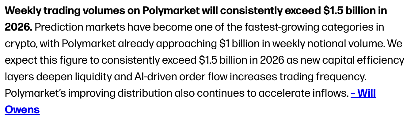 The most immediate is the rise of prediction markets. The second-order effect is altcoins. If you followed my various 2026 outlooks, you probably noticed how often prediction markets showed up as a reference point. That’s not a coincidence.