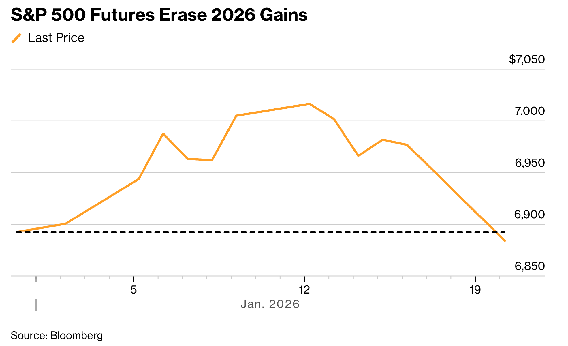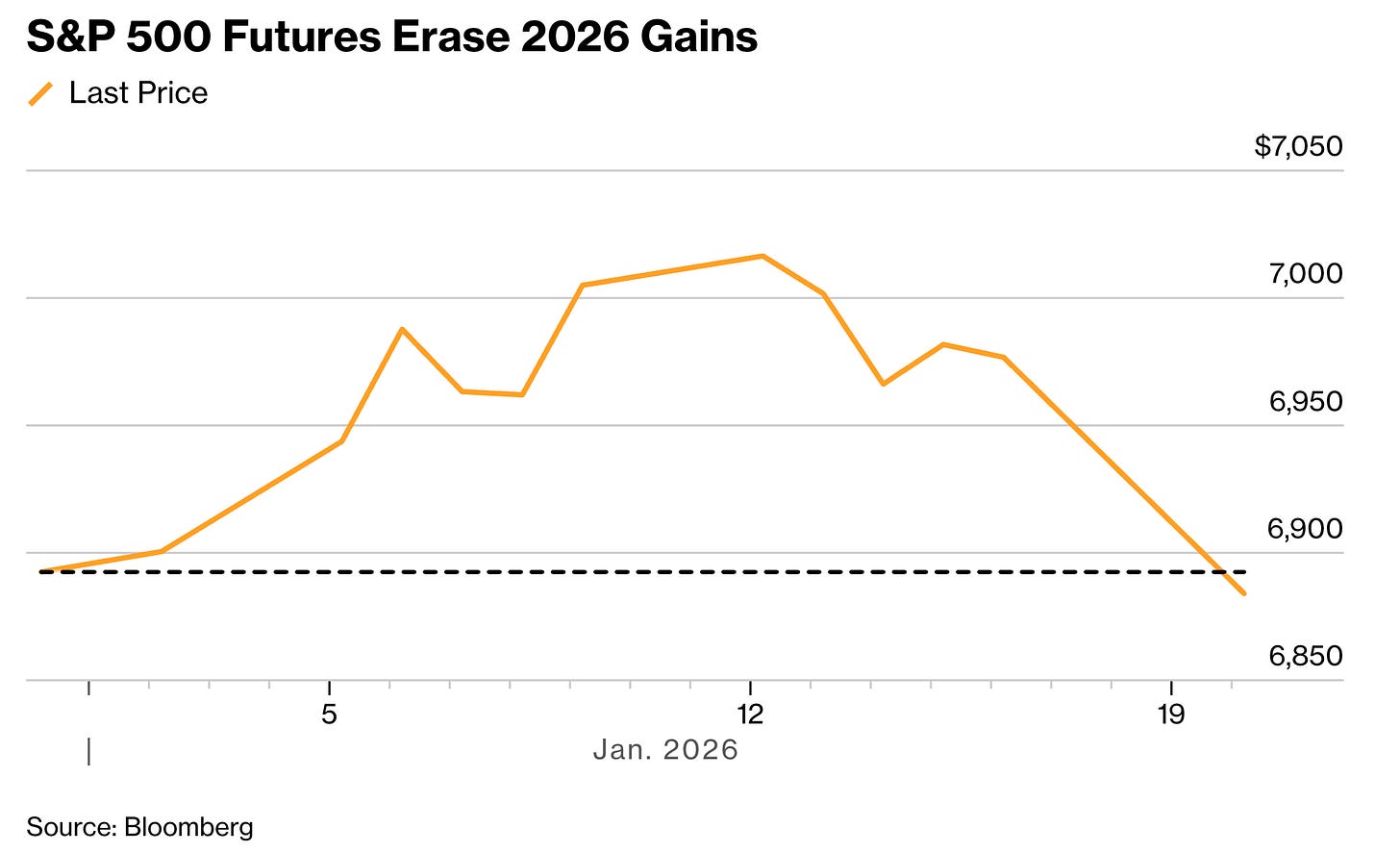 US equities slid hard, with S&P 500 futures down nearly 2% and on track to erase all gains for 2026, while Nasdaq futures fell more than 2%. European stocks also dropped as the standoff between the US and Europe over Greenland showed no signs of easing, reviving fears of a broader trade conflict. Trump’s tariff threats against France added to the unease.
