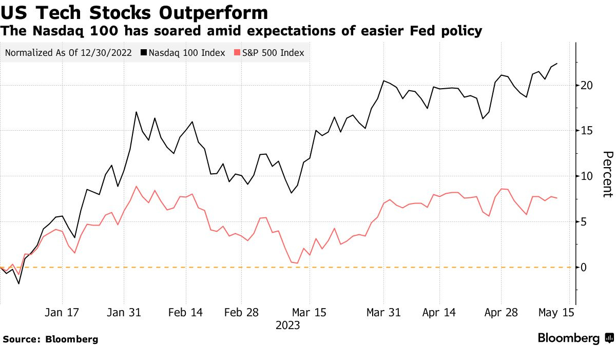 Stocks rose as investors gained confidence from strong earnings reported by Richemont, the maker of Cartier, and positive signs of progress in US lawmakers' discussions to raise the debt ceiling. Richemont's shares surged 7.8% to a record high, leading to a broader rally in European luxury stocks. S&P 500 futures also traded higher following the postponement of a meeting on the debt ceiling between President Joe Biden and House Speaker Kevin McCarthy. The delay indicates progress in staff-level talks. Despite mixed US economic data and concerns about the debt ceiling, tech stocks, represented by the Nasdaq 100 Index, have performed well this week, though skepticism about the industry remains.