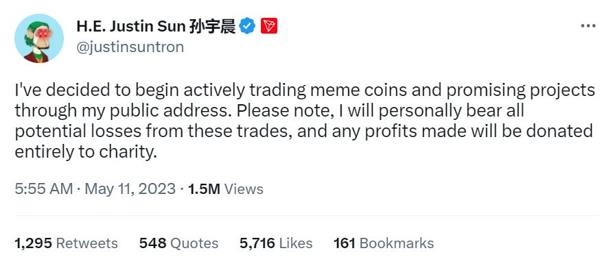 In an intriguing turn of events, Justin Sun is now trading meme coins to raise funds for charitable causes – a fascinating sign of our times. While Justin's intentions may be commendable, it's akin to adding fuel to an already fiery situation. Scammers, opportunists, and meme enthusiasts have wasted no time in sending low-quality coins to his wallet. Some are even impersonating him to deceive others. Please exercise extreme caution. Justin Sun can afford to take financial hits, many times over, but the same may not apply to the rest of us. Avoid becoming reckless in your investment decisions.