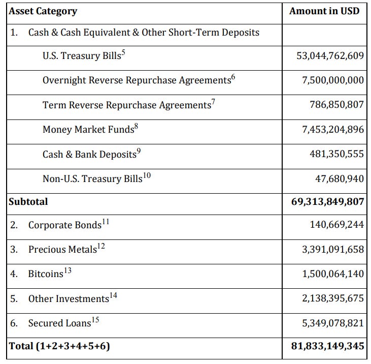 Tether has also decided to de-risk by investing in the repo market, precious metals, and corporate bonds. The image below offers a glimpse into Tether's current asset composition.