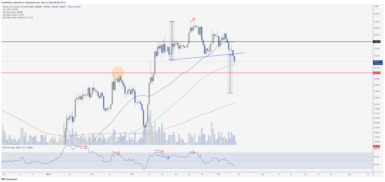 The head and shoulders pattern that I've mentioned before has been validated with the break of the blue ascending neckline. This pattern's estimated target is around $23,000, but it's noteworthy that these patterns seldom reach their targets exactly. Should the price hit $23,000, the nearing 200-day moving average (MA) could serve as a support level.